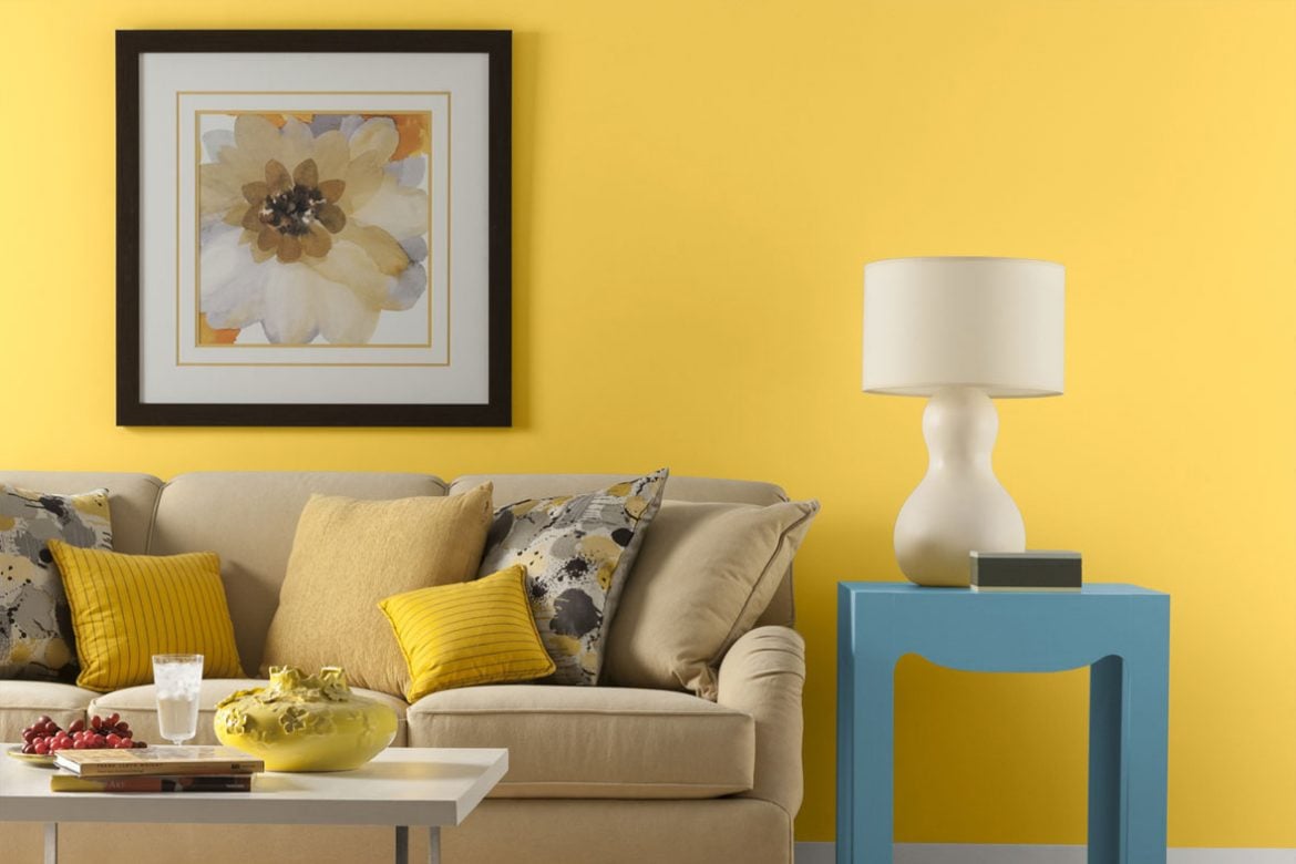Sơn phòng khách màu vàng: là màu tương sinh với các tone nhẹ, ấm áp và sang trọng như vàng nhạt, vàng kem, trứng sữa, kem sữa.
