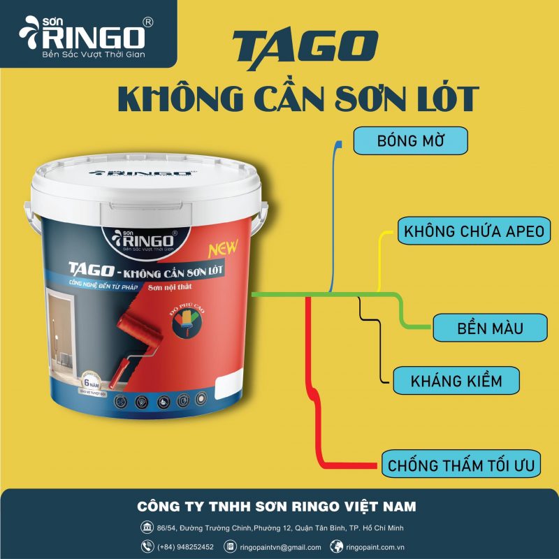 Dòng sơn mới toanh RINGO – #TAGO không cần sơn lót – công nghệ hiện đại đến từ Pháp với nhiều tính năng vượt trội như: chống thấm tối ưu, bền màu, kháng kiềm, bóng mờ, không chứa apeo