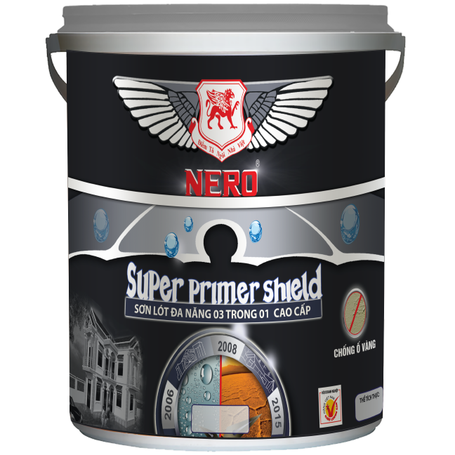 NERO SUPER PRIMER SHIELD: Là sơn lót đa năng sử dụng bên trong và bên ngoài tòa nhà, có tác dụng chống ố, chống kiềm và chống thấm gốc nước đặc biệt, có cấu tạo là nhựa Styrene Acrylic có kích hạt thật mịn, tạo màng sơn liền lạc chặt chẽ, thấm hút sâu, có khả năng ngănchặn sự nhiễm bẩn từ bên trong bức tường, trần nhà. Ngoài ra, Super Primer Shield còn có thể bám dính tốt trên bề mặt bị phấn hoa, bị dơ nhẹ, có khả năng kháng nước, kháng kiềm tốt. Đặc biệt Super Primer Shield còn là sơn lót gốc nước có thể thay thế sơn lót dùng nhựa Acrylic hệ dung môi.